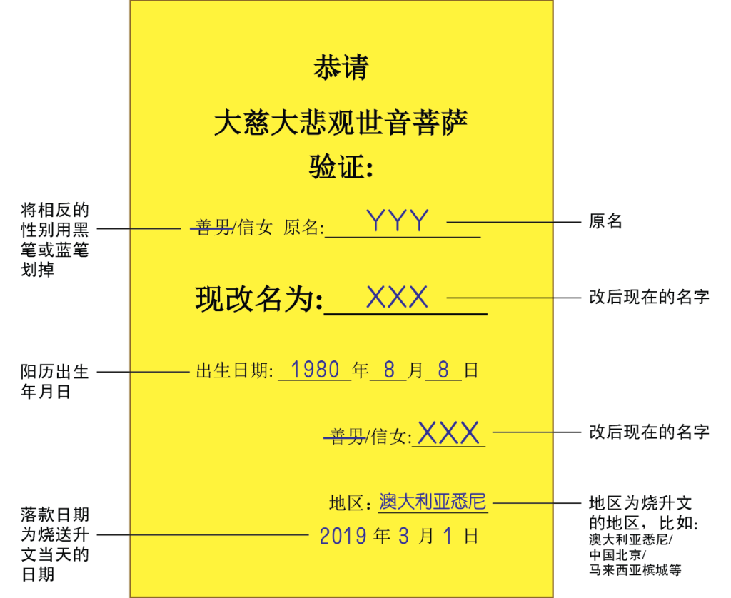 “May the Greatly Merciful and Greatly Compassionate Guan Yin Bodhisattva protect and bless me, <full name>. Today, I perform life liberation on behalf of <full name of other party>. May the Greatly Merciful and Greatly Compassionate Guan Yin Bodhisattva protect and bless me, <full name>, such that I do not shoulder the karmic obstacles of <full name of other party>. May this life liberation of <full name of other party> help to eliminate his/her karmic obstacles.”