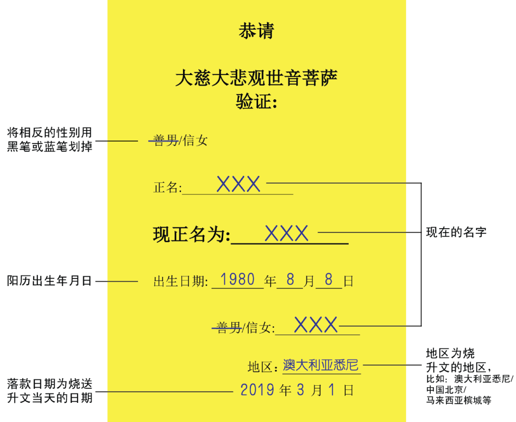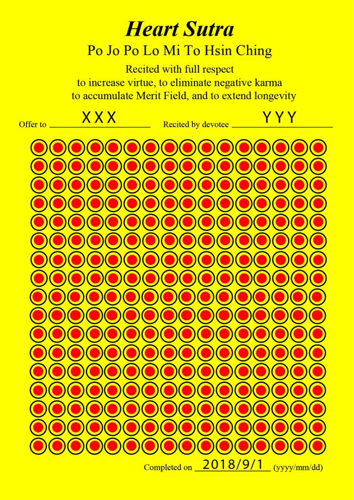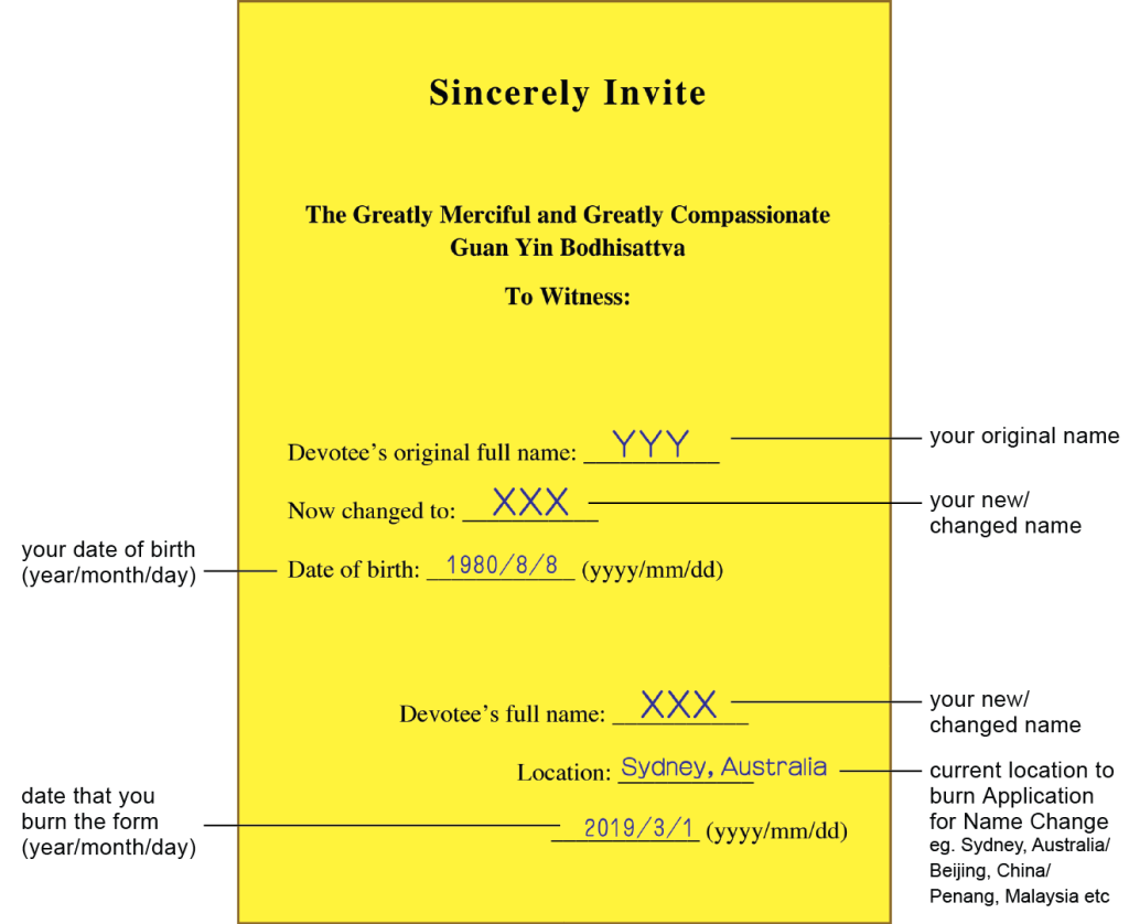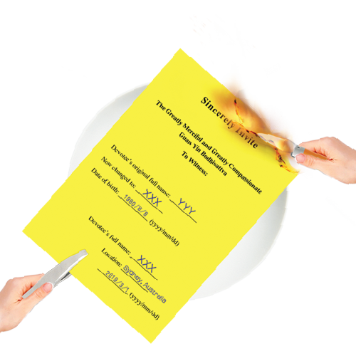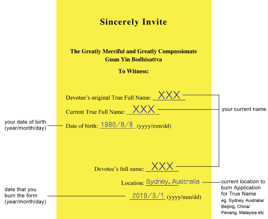 May Namo the Greatly Merciful and Greatly Compassionate Guan Yin Bodhisattva (Mo He Sa) protect and bless __________ < full name > (name of the recipient at the upper left-hand corner where it says, “Offer To:”) *__________ (pray according to respective Self-Cultivation Record Form)
