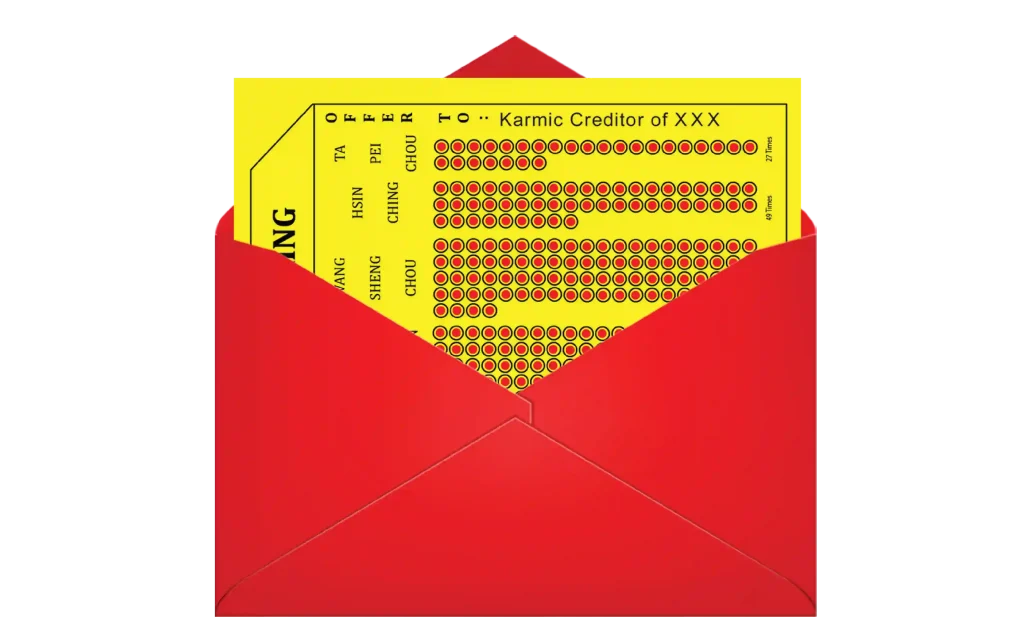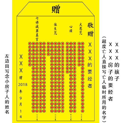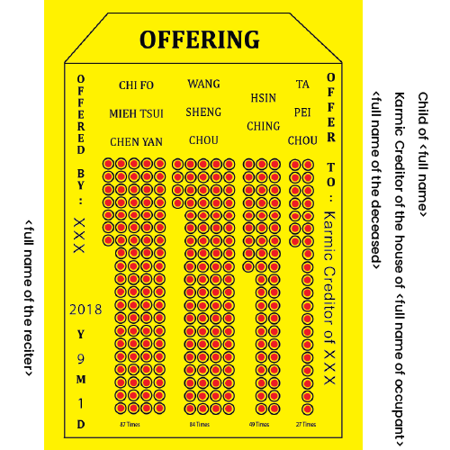 “May the Greatly Merciful and Greatly Compassionate Guan Yin Bodhisattva help me, , give these Little Houses to recipient> (which can be your Karmic Creditor, a deceased person, a Karmic Creditor of your house, or an aborted or miscarried child).”