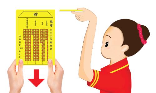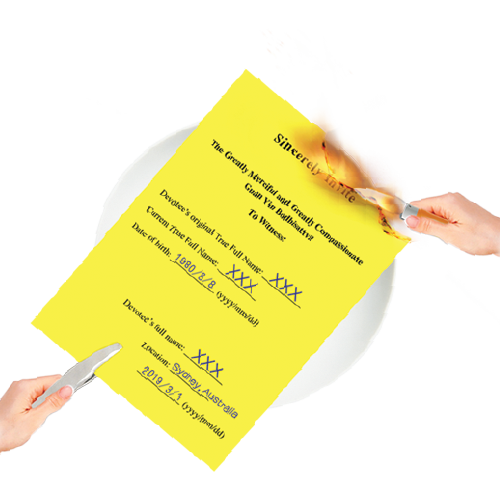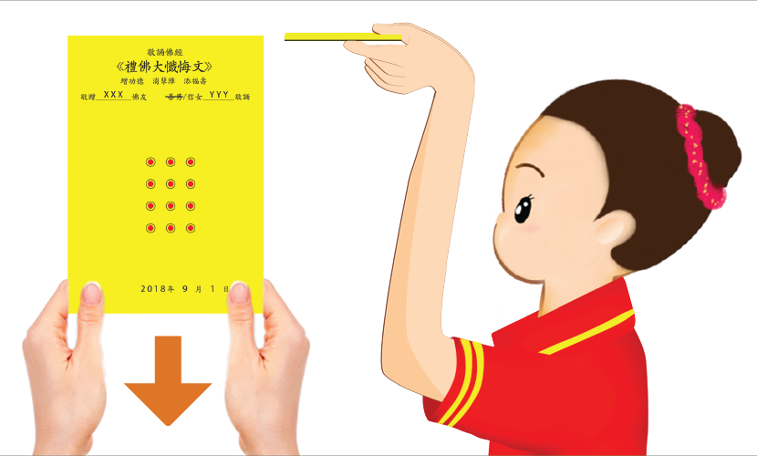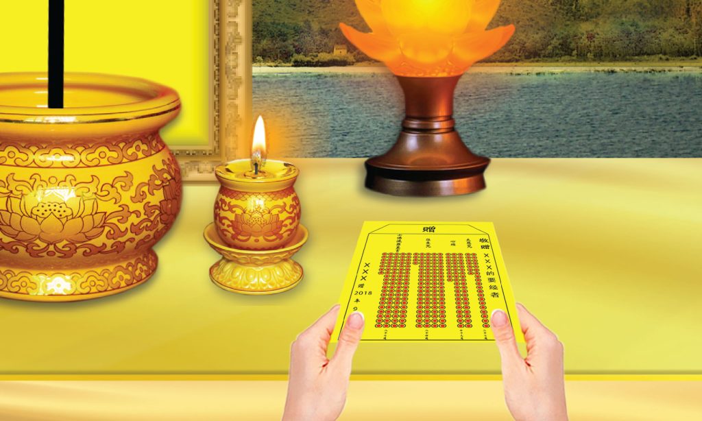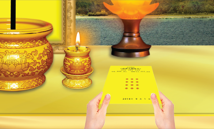 Raise the Self-Cultivation Record Form slightly above your forehead, and then place them on the altar. Kneel down, join your palms together and say the following prayer: