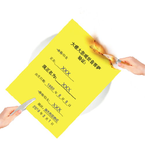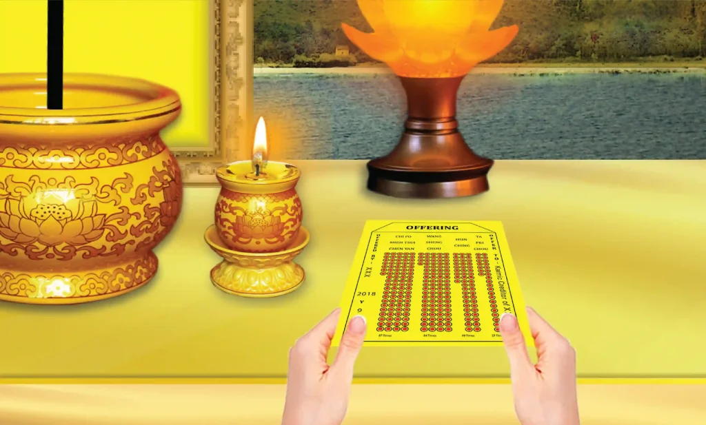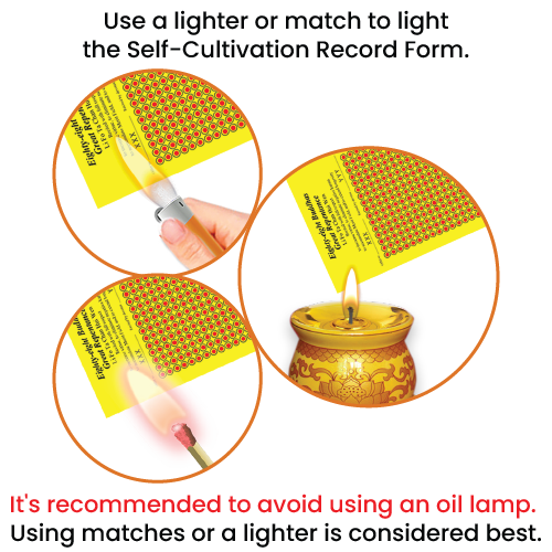 Note: You may light the Self-Cultivation Record Form using the flame from the oil lamp on the altar, a match or a lighter.