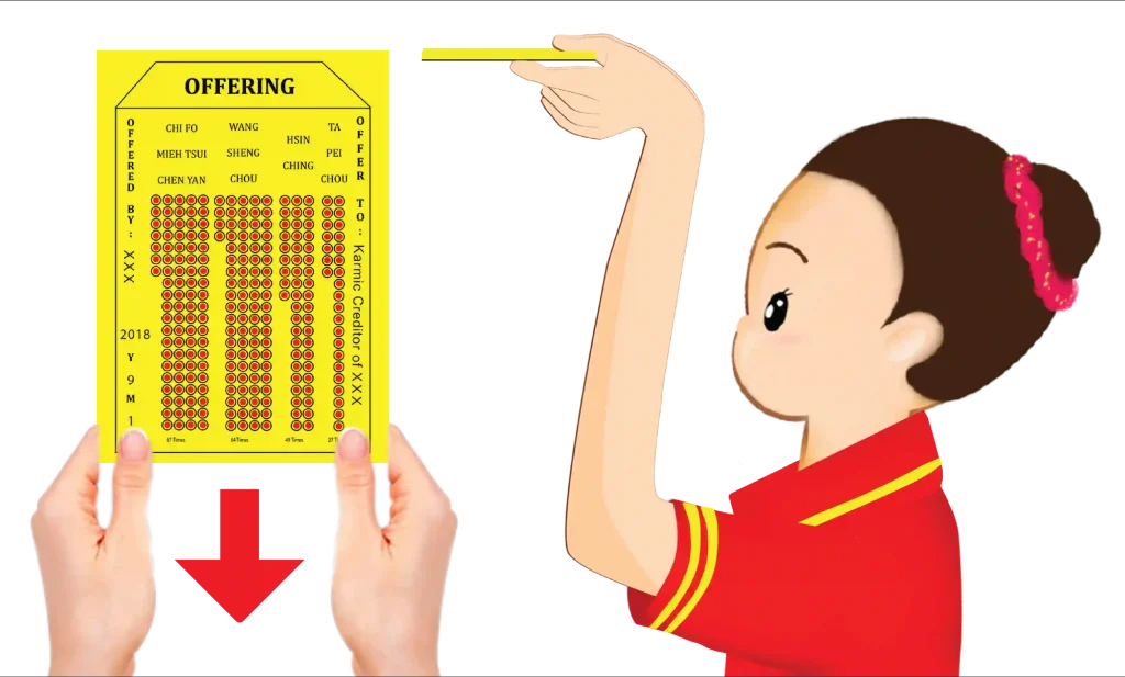 “May the Greatly Merciful and Greatly Compassionate Guan Yin Bodhisattva help me, , give these Little Houses to recipient> (which can be your Karmic Creditor, a deceased person, a Karmic Creditor of your house or an aborted or miscarried child).”