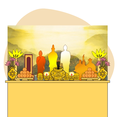 Raise the Little Houses slightly above your forehead, and then place them on the altar. Kneel down, join your palms together and say the following prayer: